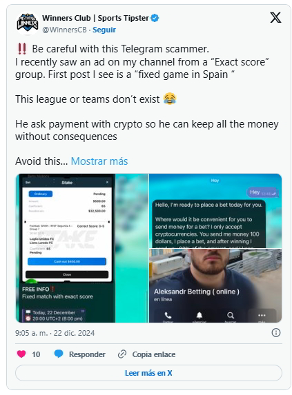 - Engaño del partido fijo: En estos casos, el estafador empezará por encontrar un grupo de personas interesadas en partidos previamente “arreglados”: digamos 30 individuos. El estafador les pedirá que paguen por adelantado y les dirá a 10 que apuesten por un resultado, a 10 que apuesten por otro y a 10 que apuesten por un tercero (en la mayoría de los partidos deportivos, sólo hay tres resultados posibles). Los 10 individuos para los que el pronosticador predijo el resultado correcto piensan ahora que acaban de apostar en un auténtico partido alterado, y se verán incentivados a apostar más dinero en el siguiente partido. Los que no hayan ganado serán bloqueados por el estafador.