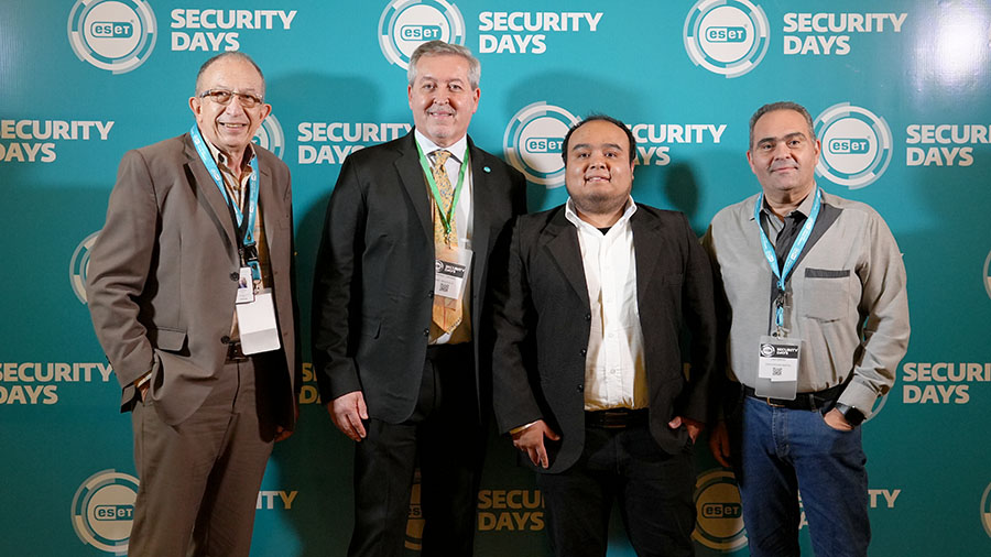 Además de sus clientes y asesorados, diferentes aliados y partners acompañaron a los representantes de ESET en su Security Day 2025. Flammia y González, al centro, junto a Germán Febres (Director de Grupo El Sumario) y Lino Simoes (Gerente General de MásQueSeguridad)