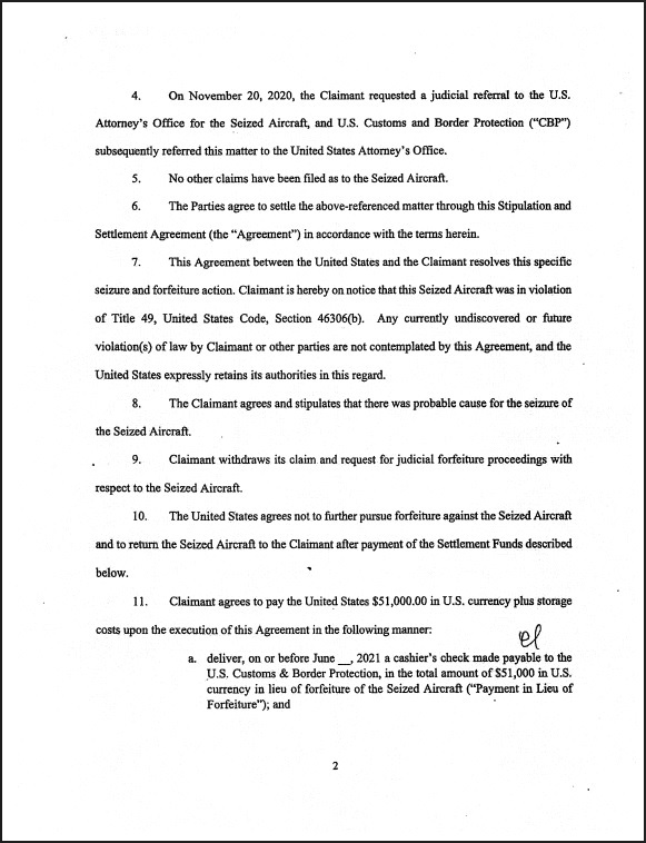 Contrario a las afirmaciones sensacionalistas, el acuerdo no implica admisión de delito alguno. En el mismo, Encanto Investments estipula que “existía causa probable para la incautación”, pero esto se limita a irregularidades administrativas en el proceso de sucesión. El mismo documento indica que la empresa retira su reclamación y solicitud de procedimientos judiciales, a la vez que establece que los Estados Unidos “acuerdan no proseguir con la retención” y devolver la aeronave tras el pago de los ‘Fondos de Arreglo’.